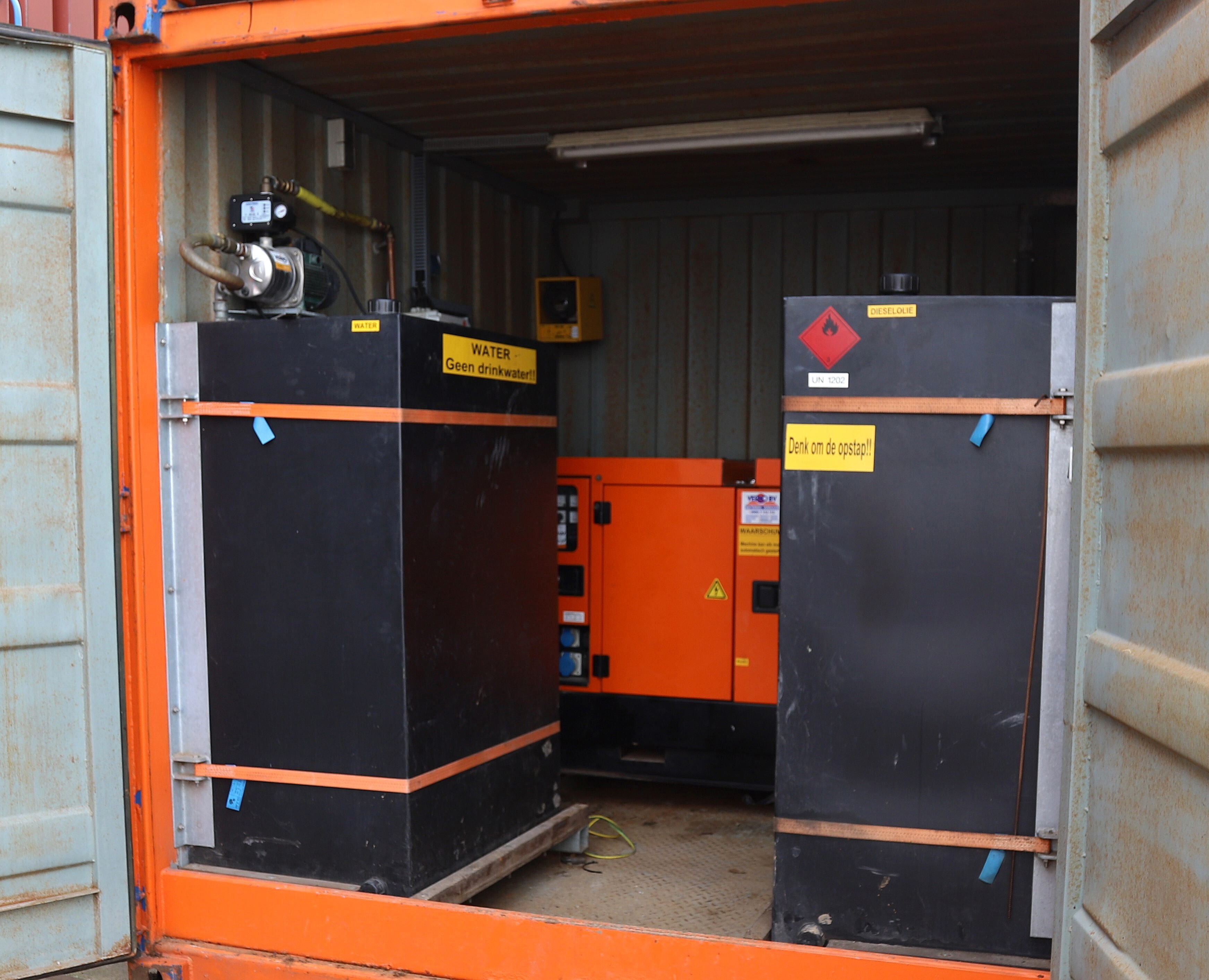 35 kVA aggregaat, brandstoftank en watertank